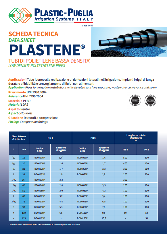 LDPE toru kastmissüsteemide paigaldamiseks PLASTENE on madala tihedusega polüetüleenist toru PE32, musta värvi ekstrudeeritud sinise triibuga ülaosas, kustutamatu märgistusega, valmistatud valitud materjalidest, et tagada pikk kasutusiga ja kõrge usaldusväärsus, vastab UNI 7990:2015 nõuetele. PLASTENE toru sobib aluskastmissüsteemidele, antennidele, avatud välitingimustes ja kasvuhoonete ehitamiseks, kasutades madalat töörõhku. Seda kasutatakse ka mitte-toiduainete vedelike transportimiseks. Kasutamine: Kasvuhoone – Avatud väli – Puukultuurid Omadused Tooraine: polüetüleen PE32 Vastupidav UV-kiirgusele, mikroorganismide ja hallituse seente mõjule Vastupidav soolasele veele, hapetele või leeliseliste lahuste mõjule, mida tavaliselt kasutatakse põllumajanduses. Vastab standarditele: UNI 7990:2015