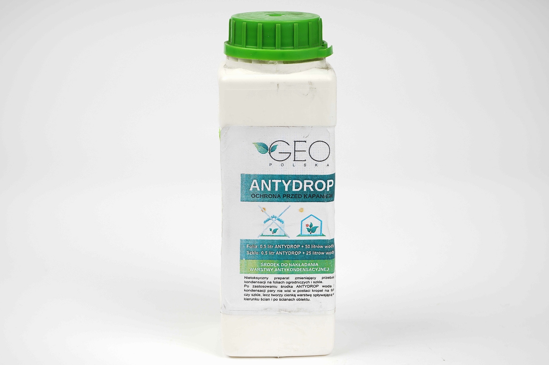 Kasutamine: Kilekasvuhoonetele: 1 liiter ANTYDROP segada 100 liitri veega (soovitavalt destilleeritud või vihmavesi), kui kile on kuiv või märg, siis 50 liitri veega. Klaasile: 1 liiter ANTYDROP segada 50 liitri veega (soovitavalt destilleeritud või vihmaveega). Suurendab valguse läbilaskvust kuni 17%, Omadused: Suurendab päikese soojuse hulka kasvuhoones, vähendades küttekulusid; Vähendab taimede haavatavust infektsioonidele (nt hallmädanik); Hoiab ära kondensvee tilkumise kultuuridele; Antistaatiline; Ei sisalda toksilisi lisandeid; Kõrge jõudlus: 500-1000m2; Pikaajaline mõju: 2 - 5 aastat.