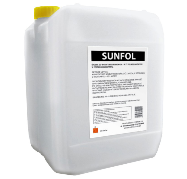 Kasutamine: Kontsentraat lahjendada: 2 liitrit SUNFOL 10 liitri veega. Puhastuslahus valmistada plastmasskonteinerites. Olge puhastusvahendi kasutamisel väga ettevaatlik. Pärast 15-minutilist toimet tuleb vahend maha loputada tugeva veesurvel, et vältida pleekimist, tööd tuleks teha pilves ilmaga ja soovitatavalt tuulevaikuses. 20l toime: 500-1000m2 kile